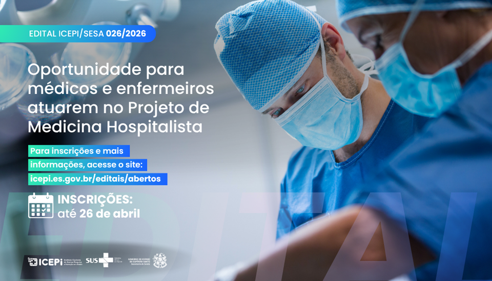 A Secretaria da Saúde (Sesa), por meio do Instituto Capixaba de Ensino, Pesquisa e Inovação em Saúde (ICEPi), publicou o edital ICEPi/Sesa nº 026/2026 para formação de cadastro de reserva de médicos e enfermeiros para o Projeto de Medicina Hospitalista. As inscrições começam nesta quinta-feira (09) e vão até 26 de abril.