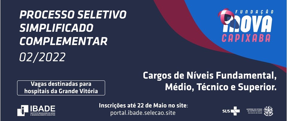 A Fundação Estadual de Inovação em Saúde – iNOVA Capixaba, por meio do Instituto Brasileiro de Apoio e Desenvolvimento Executivo (Ibade), divulgou o novo processo seletivo simplificado complementar, com 45 vagas destinadas à contratação imediata e complementação de cargos do cadastro de reserva para hospitais da Região Metropolitana Grande Vitória. As inscrições estão abertas e seguem até o dia 22 de maio.
