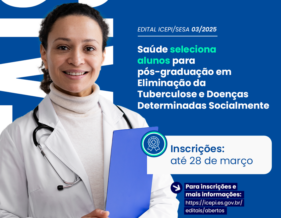 O curso de pós-graduação lato sensu em Eliminação da Tuberculose e Doenças Determinadas Socialmente, ofertado pelo Instituto Capixaba de Ensino, Pesquisa e Inovação em Saúde (ICEPi), está com inscrições abertas até o dia 28 de março. Podem se inscrever servidores de Secretarias Municipais de Saúde e de Assistência Social, das Superintendências Regionais de Saúde e de Assistência Social e das Secretarias Estaduais da Saúde e de Assistência Social.