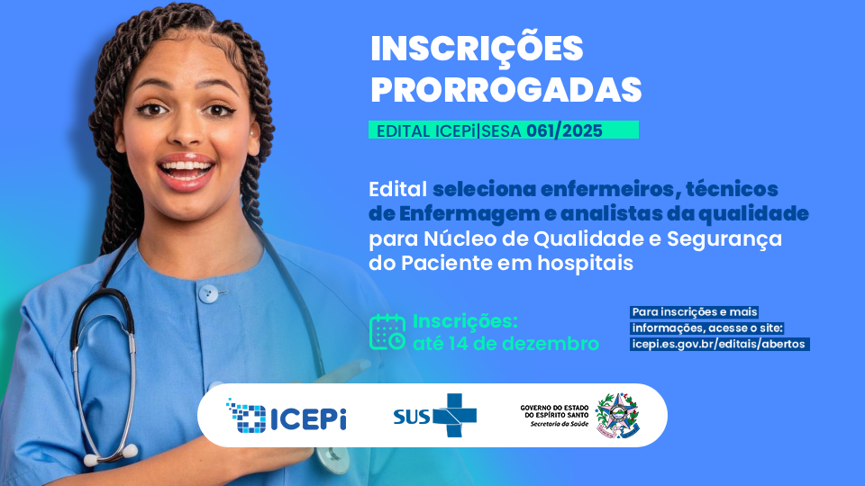 A Secretaria da Saúde (Sesa), por meio do Instituto Capixaba de Ensino, Pesquisa e Inovação em Saúde (ICEPi), prorrogou o período de inscrições do edital ICEPi/Sesa nº 061/2025, com cadastro de reserva para enfermeiros, técnicos de Enfermagem e analistas da qualidade em hospitais da rede própria estadual. As inscrições poderão ser feitas até o dia 14 de dezembro, pelo site https://icepi.es.gov.br/editais/abertos, e o edital está disponível no mesmo endereço eletrônico.