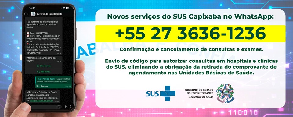 Agora, o novo sistema de avisos da Sesa pelo WhatsApp (27) 3636-1236 vai enviar mensagens, a partir deste mês, aos pacientes do SUS, confirmando a identidade deles e avisando sobre as consultas e exames. Caso confirmem presença, eles receberão informações dos agendamentos e um código de liberação das consultas.