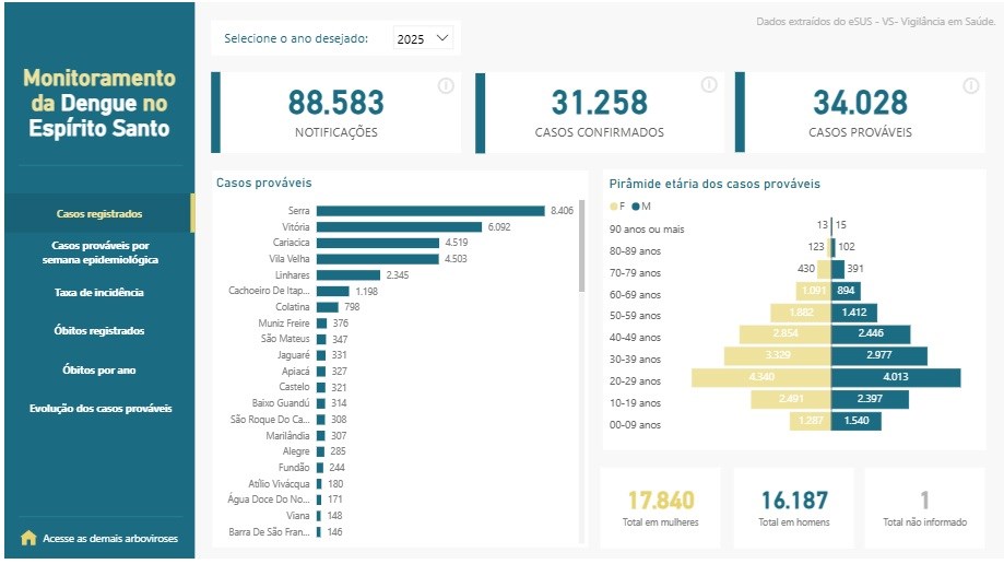 Lançado em novembro de 2025, o Painel “Monitoramento das Arboviroses no Espírito Santo” traz um ambiente virtual com interfaces que apresentam dados diários a respeito das quatro Arboviroses, tanto aquelas causadas pelo Aedes aegypti, como a dengue, chikungunya e Zika, quanto a causada pelo maruim, como a Febre do Oropouche. O painel é uma das ações articuladas pelo Centro Integrado de Comando e Controle das Arboviroses (CICC – Arbovirose).
