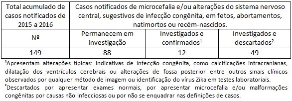 A Secretaria de Estado da Saúde informa, ainda, que entre 22 de novembro de 2015 e 28 de maio de 2016 foram notificados no Espírito Santo 149 casos de microcefalia em bebês nascidos vivos, natimortos ou em gestação. Destes, 88 permanecem em investigação, 49 foram descartados e 12 foram confirmados para microcefalia.