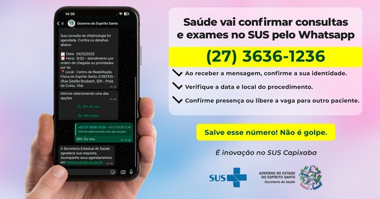 Os pacientes do Sistema Único de Saúde (SUS) do Espírito Santo vão confirmar a presença em consultas e exames por mensagem no WhatsApp (27) 3636-1236 do Governo do Estado. De qualquer lugar, eles vão poder desmarcar ou confirmar procedimentos médicos, sem precisar ir à unidade básica de saúde, poupando tempo e deslocamentos.