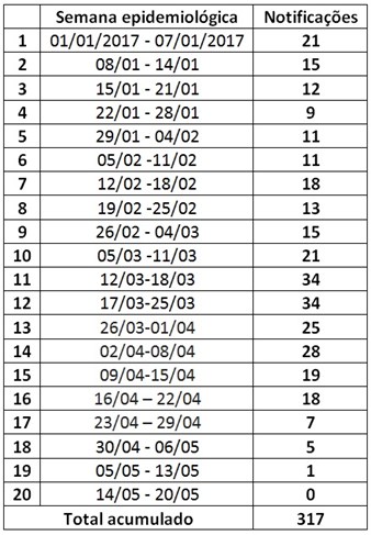 Tabela com o número de casos de zika por semana epidemiológica 2017