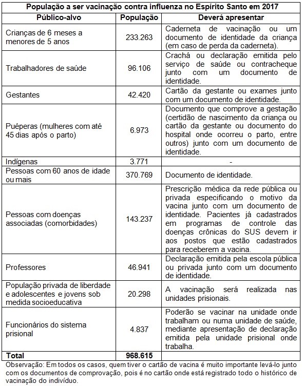 A Secretaria de Estado da Saúde (Sesa) reforça o pedido para que somente quem faz parte do grupo prioritário definido pelo Ministério da Saúde procure um posto de vacinação no período da campanha para receber a dose. Segundo a coordenadora do Programa Estadual de Imunizações, Danielle Grillo, a meta é vacinar, pelo menos, 90% das pessoas que estão no grupo prioritário.