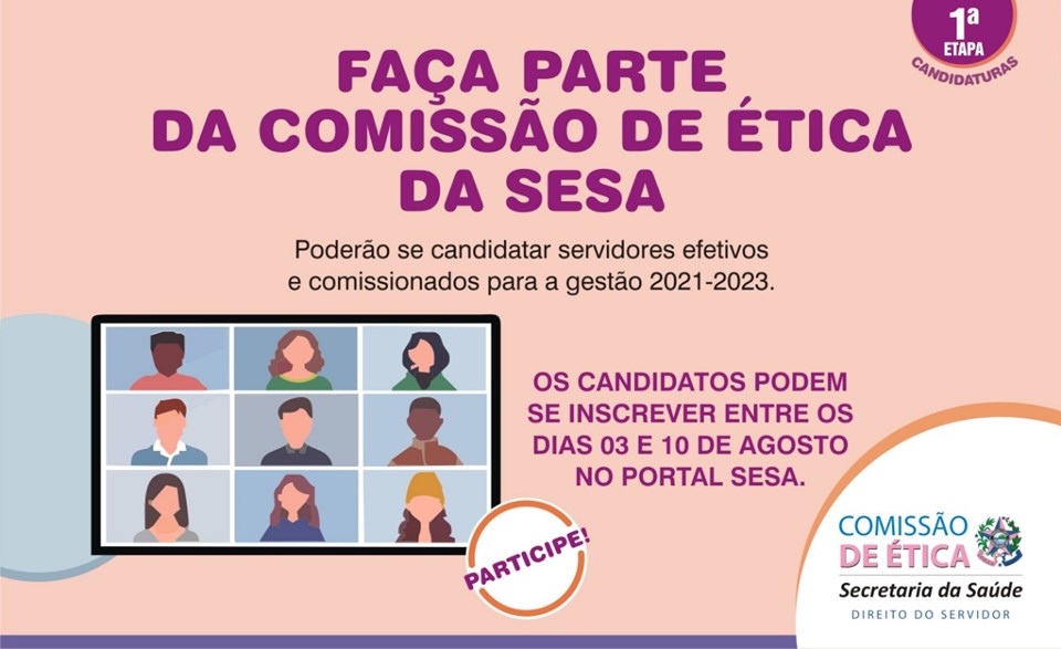 Tem início nesta terça-feira (03), a fase de candidatura dos integrantes que irão compor a Comissão de Ética da Secretária da Saúde (Sesa). Serão eleitos servidores que atuam em qualquer unidade administrativa da Secretaria, que terão a responsabilidade de zelar pela conduta ética nas dependências do órgão estadual.
