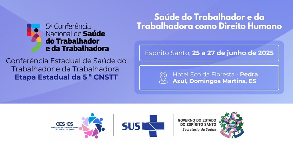 O Conselho Estadual de Saúde do Espírito Santo (CES/ES) realizará entre os dias 25 e 27 de junho, a Etapa Estadual da 5ª Conferência Nacional de Saúde do Trabalhador e da Trabalhadora (5ª CNSTT). O encontro será realizado no Hotel Eco da Floresta, em Pedra Azul, no município de Domingos Martins, com o tema central ‘Saúde do Trabalhador e da Trabalhadora como Direito Humano’.