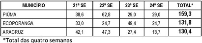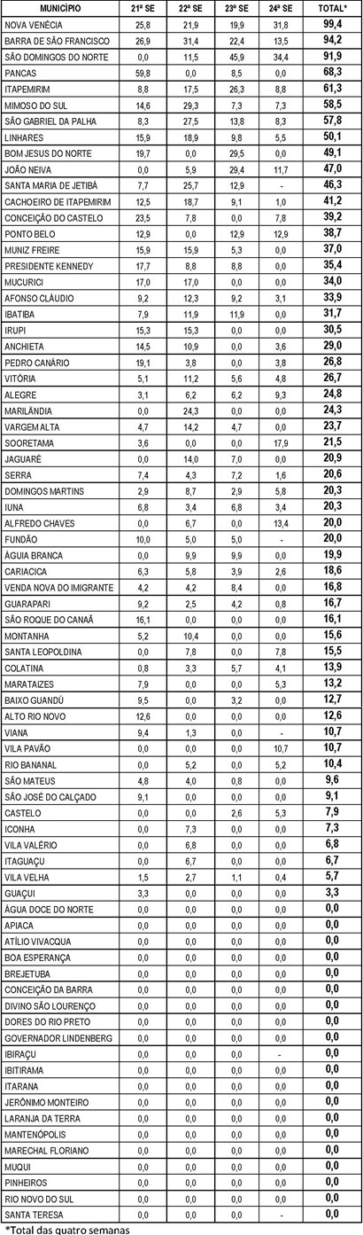 A Secretaria de Estado da Saúde (Sesa) vem registrando queda no número de casos notificados de dengue, e durante quatro semanas seguidas nenhum município apresenta alta incidência da doença. Do total de incidência acumulada das últimas quatro semanas, 96% das cidades capixabas aparecem com baixa incidência (confira na tabela abaixo). Isso é resultado do trabalho do Gabinete de Monitoramento de Combate ao Aedes aegypti, que avalia e define estratégias de combate ao mosquito, em conjunto com municípios e superintendências regionais de Saúde do Estado, e do apoio da população.