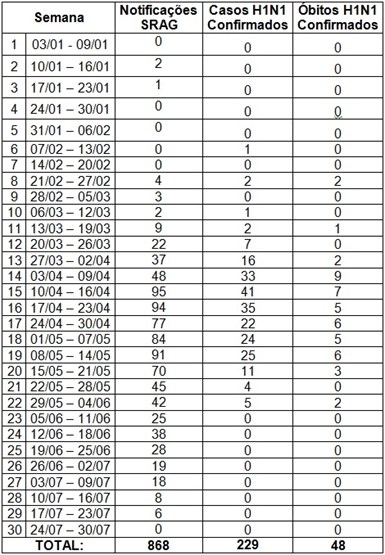Na última semana epidemiológica, nenhum caso de Síndrome Respiratória Aguda Grave foi notificado no Estado. Com relação ao número de óbitos por H1N1, foram confirmados 48 entre os dias 03 de janeiro e 30 de julho deste ano, sendo que os últimos óbitos confirmados referem-se aos meses de abril e maio. Outros 06 óbitos estão em investigação para determinar o agente causador.