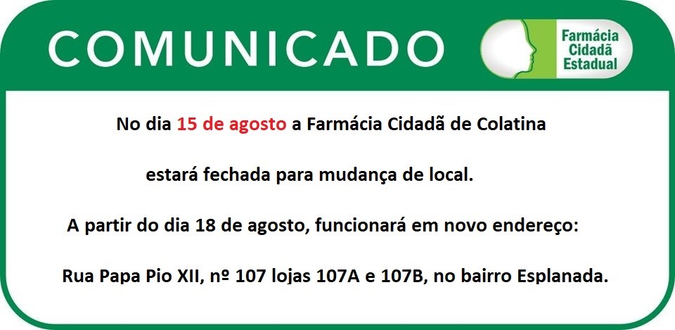 A Farmácia Cidadã Estadual de Colatina passará a funcionar em um novo endereço a partir do dia 18 de agosto, às 8 horas. A nova sede está localizada na Rua Papa Pio XII, nº 107, lojas 107A e 107B, no bairro Esplanada.