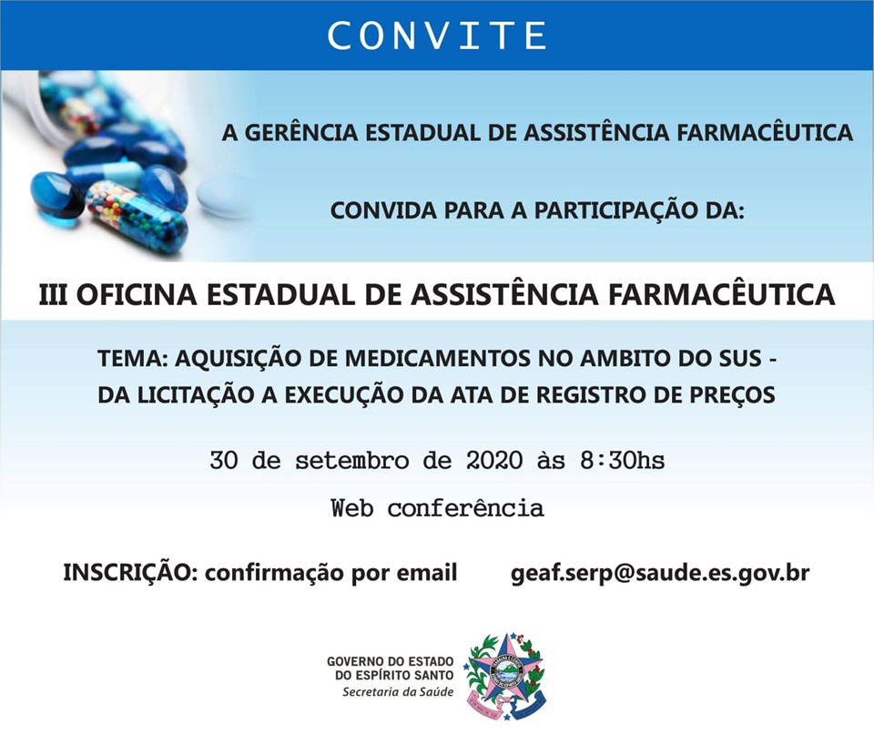No próximo dia 30 de setembro será realizada pela Gerência Estadual de Assistência Farmacêutica (GEAF) da Secretaria da Saúde (Sesa), a III Oficina de Assistência Farmacêutica. Essa edição abordará o processo de aquisição de medicamentos no âmbito do Sistema Único de Saúde (SUS), desde a licitação até a execução da Ata de Registro de Preço.