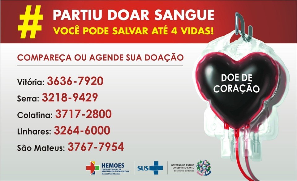 Diante dessa situação, o Hemoes convida a população para adotar a prática da doação de sangue, mas de forma frequente, ou seja, que as pessoas possam se tornar doadoras regulares de sangue. “Sugerimos sempre que cada um faça o exercício de se colocar no lugar do outro e pensar que em algum momento da vida pode ser ele ou alguém da família precisando de sangue. No Hemoes, nós só administramos um recurso, no caso, o sangue. Porque sangue ainda não se fabrica em laboratório nem se compra. É doado e a doação depende do espírito de solidariedade”, disse a diretora técnica do Hemoes, Rachel Lacourt.