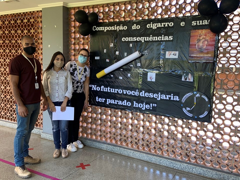 Nesta segunda-feira (24), um mural com a composição do cigarro e suas consequências foi montado pela equipe do Serviço Especializado em Engenharia de Segurança e em Medicina do Trabalho do Himaba (Sesmt), na área verde do hospital. O painel trazia uma reflexão com a frase “No futuro você desejaria ter parado hoje!”. A equipe fez ainda a abordagem das pessoas que passavam pelo local.