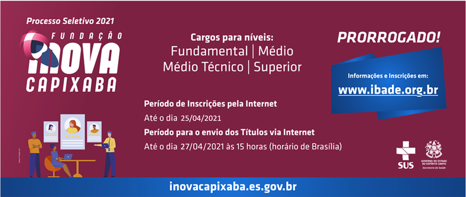 Com a última retificação, os interessados poderão se inscrever até o dia 25 de abril pelo site www.ibade.org.br ou https://inovacapixaba.es.gov.br.