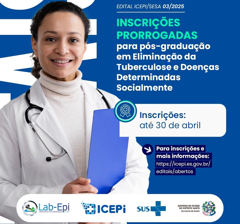 O curso de pós-graduação lato sensu em Eliminação da Tuberculose e Doenças Determinadas Socialmente, ofertado pelo Instituto Capixaba de Ensino, Pesquisa e Inovação em Saúde (ICEPi), teve as inscrições prorrogadas até o dia 30 de abril. Podem se inscrever servidores de Secretarias Municipais de Saúde e de Assistência Social, das Superintendências Regionais de Saúde e de Assistência Social e das Secretarias Estaduais da Saúde e de Assistência Social.