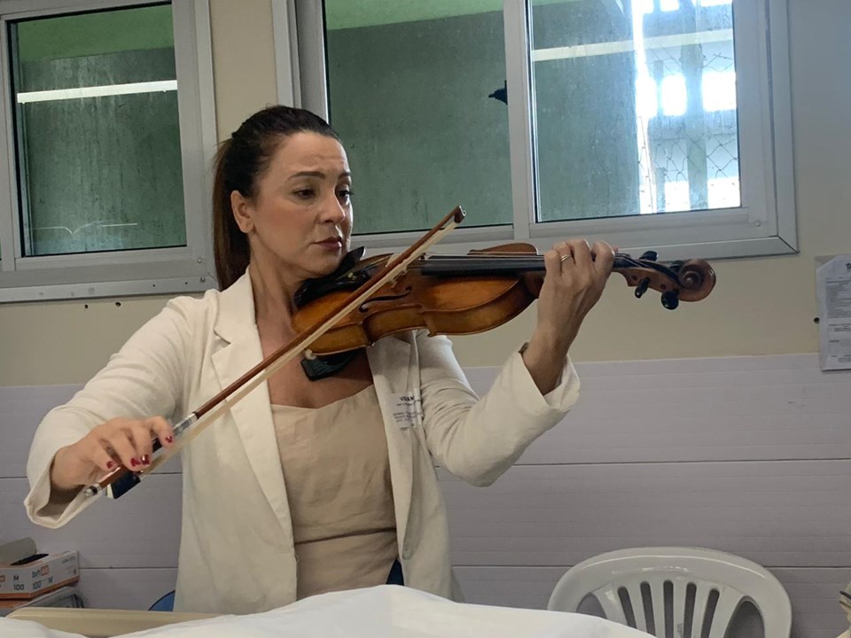 A visitante foi a violinista Érica Moreira, colega de longa data do paciente nas apresentações musicais em cerimônias e na igreja. Ela entrou na UTI tocando violino. A emoção foi tanta que, por instantes, suas mãos tremularam, dificultando a execução da música, mas isso em nada diminuiu a força da homenagem, carregada de significado e afeto.