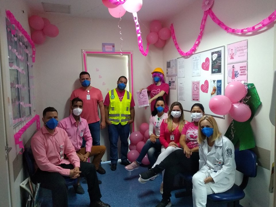 No Hospital Estadual Dório Silva, na Serra, o Serviço de Higienização e Rouparia da unidade elaborou um mural em um dos corredores principais e providenciou camisas para uso da equipe durante o mês de outubro.