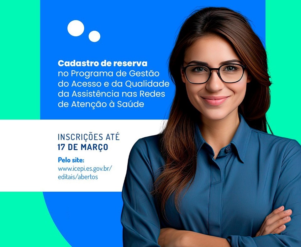 A Secretaria da Saúde (Sesa), por meio do Instituto Capixaba de Ensino, Pesquisa e Inovação em Saúde (ICEPi), lançou um edital para cadastro de reserva no Programa de Gestão do Acesso e da Qualidade da Assistência nas Redes de Atenção à Saúde (PGAQ). As inscrições têm início nesta segunda (04) e vão até o dia 17 de março, pelo site https://icepi.es.gov.br/editais/abertos. O edital também pode ser consultado nesse endereço eletrônico.