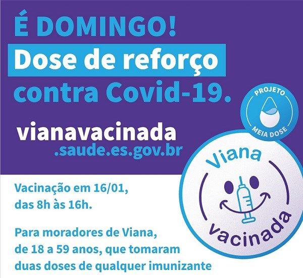 A meia dose já está sendo oferecida em todos os postos de vacinação do município. O Dia D de Mobilização está sendo organizado pela Prefeitura de Viana nos seguintes locais: Cemei Manoel Evêncio de Oliveira, em Nova Bethânia; Cemei Maria de Lourdes Coutinho Passos, em Vila Bethânia; Emef Marcílio de Noronha, em Marcílio de Noronha; Emef Orestes Souto Novaes, em Jucu, e na Emef Padre Antunes Siqueira, em Viana Sede.