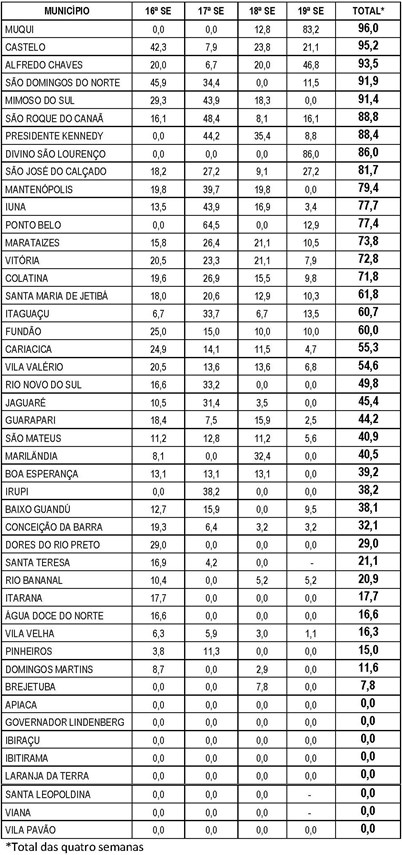 O Boletim Epidemiológico da Dengue é apresentado de duas formas: uma tabela com a indicação das notificações em números absolutos por semana epidemiológica e outra com a incidência de casos de dengue por município.