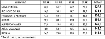 O Boletim Epidemiológico da Dengue é apresentado de duas formas: uma tabela com a indicação das notificações em números absolutos por semana epidemiológica e outra com a incidência de casos de dengue por município.