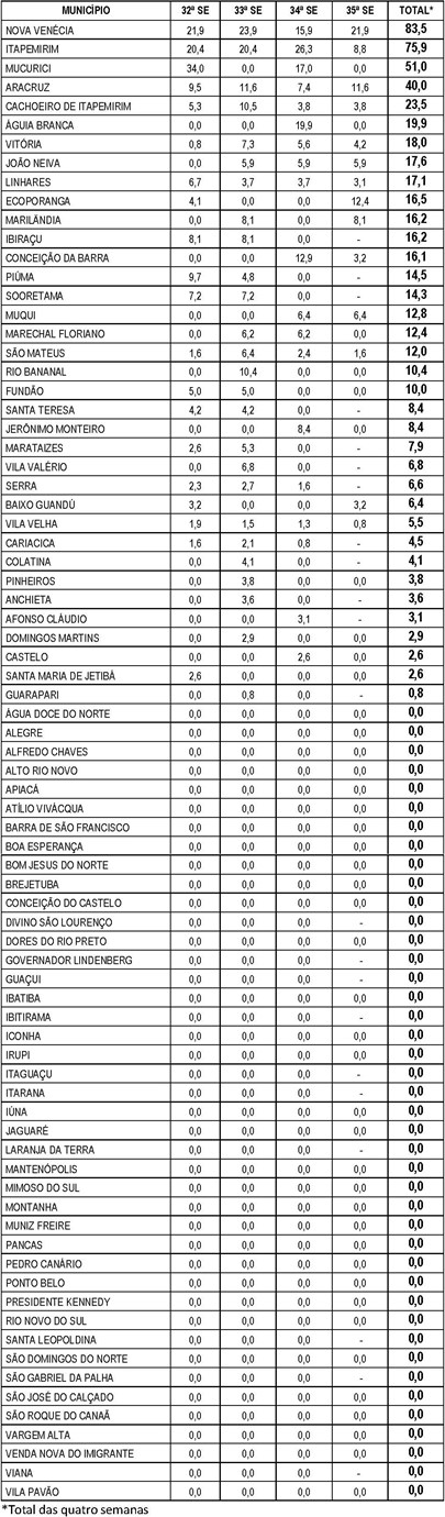 A Secretaria de Saúde do Espírito Santo (Sesa) vem registrando baixa incidência de dengue em todos os municípios. Esse resultado é fruto tanto do trabalho do Gabinete de Monitoramento de Combate ao Aedes aegypti, que avalia e define estratégias de combate ao vetor da dengue, em conjunto com municípios e superintendências regionais de Saúde do Estado, quanto do apoio da população na eliminação dos focos do mosquito.