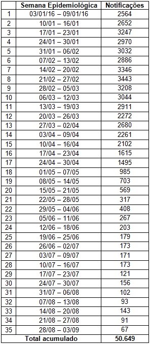 O Boletim Epidemiológico da Dengue é apresentado de duas formas: uma tabela com a indicação das notificações em números absolutos por semana epidemiológica e outra com a incidência de casos de dengue por município.