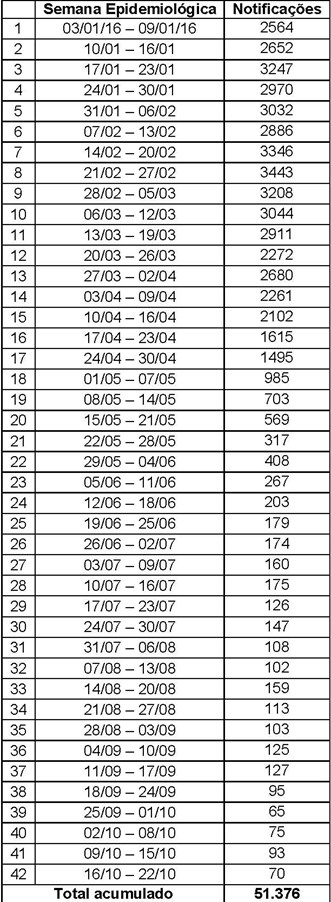 Entre 03 de janeiro e 22 de outubro de 2016, foram notificados 51.376 casos de dengue no Espírito Santo. Destes, 667 são suspeitos da forma grave, 22 são óbitos confirmados e 17 são óbitos sob investigação. No mesmo período, a taxa de incidência da doença no Estado ficou em 1.307,31. Essas informações são enviadas à Secretaria de Estado da Saúde até o dia anterior à divulgação do boletim epidemiológico.