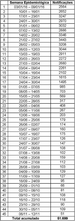 O Boletim Epidemiológico da Dengue é apresentado de duas formas: uma tabela com a indicação das notificações em números absolutos por semana epidemiológica e outra com a incidência de casos de dengue por município.