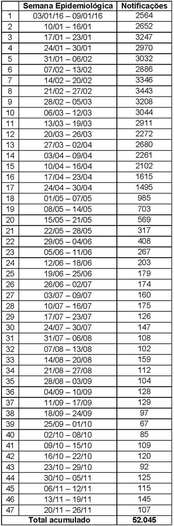 Foram notificados 52.045 casos de dengue, entre 03 de janeiro e 26 de novembro de 2016, no Espírito Santo. Destes, 667 são suspeitos da forma grave, 22 são óbitos confirmados e 17 são óbitos sob investigação. No mesmo período, a taxa de incidência da doença no Estado ficou em 1.324,33. Essas informações são enviadas à Secretaria de Estado da Saúde até o dia anterior à divulgação do boletim epidemiológico.