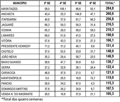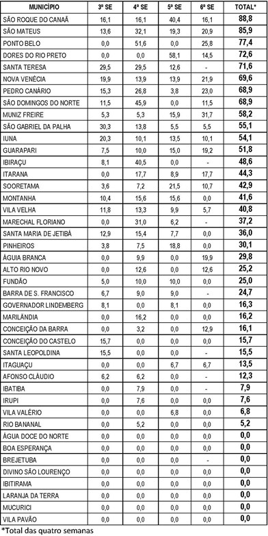 O Boletim Epidemiológico da Dengue é apresentado de duas formas: uma tabela com a indicação das notificações em números absolutos por semana epidemiológica e outra com a incidência de casos de dengue por município.