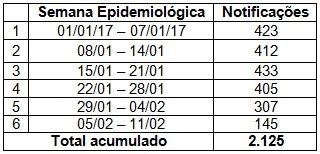 O Boletim Epidemiológico da Dengue é apresentado de duas formas: uma tabela com a indicação das notificações em números absolutos por semana epidemiológica e outra com a incidência de casos de dengue por município.