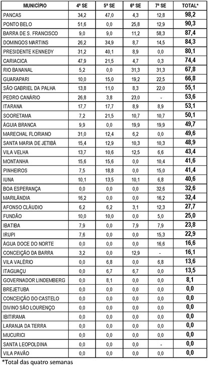 O Boletim Epidemiológico da Dengue é apresentado de duas formas: uma tabela com a indicação das notificações em números absolutos por semana epidemiológica e outra com a incidência de casos de dengue por município.