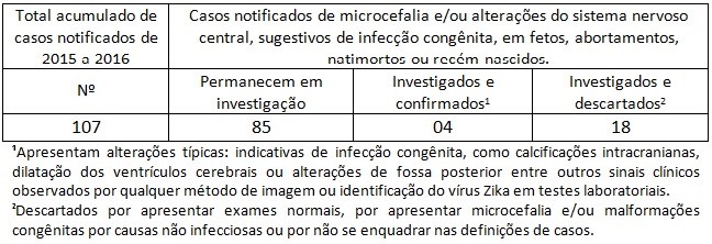 Todos os casos estão sendo investigados. Vale ressaltar que a microcefalia pode ser causada por diversos agentes infecciosos além do vírus zika, tais como sífilis, toxoplasmose, rubéola, citomegalovírus e herpes viral.