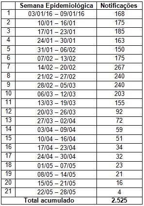 Tabela com o número de casos de zika por semana epidemiológica 2016