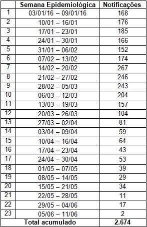 Tabela com o número de casos de zika por semana epidemiológica 2016