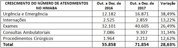 O número de atendimentos realizado no Hospital Estadual Infantil e Maternidade de Vila Velha (Himaba), entre outubro e dezembro de 2017, aumentou 28,63% se comparado ao mesmo período de 2016. Entre internações, atendimentos de urgência e emergência, exames, consultas ambulatoriais e procedimentos cirúrgicos, o hospital realizou 71.854 atendimentos nos três últimos meses do ano passado contra 55.858 em igual período do ano anterior.