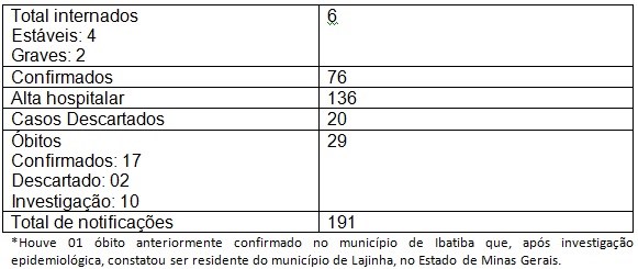 Os 76 casos confirmados são de moradores de Ibatiba (17), Colatina (14), Brejetuba (06), Baixo Guandu (04), Conceição do Castelo (04), Afonso Cláudio (04), Muniz Freire (04), Laranja da Terra (04), Itarana (03), Itaguaçu (02), Pancas (02), São Roque do Canaã (02), Irupi (02), e Castelo (02), Iúna (01), Marilândia (01), Cachoeiro de Itapemirim (01), Fundão (01), Ibiraçu (01), Ibitirama (01). Com isso, há 95 casos em investigação com quadro indicativo também de leptospirose, febre maculosa, dengue e outras doenças com sintomas semelhantes.