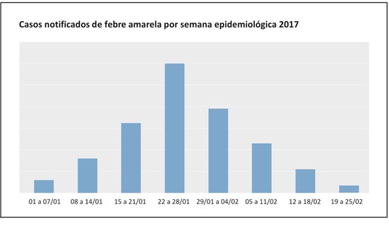 Até sexta-feira (24), a Secretaria de Estado da Saúde do Espírito Santo (Sesa) recebeu 191 notificações de suspeita de febre amarela. Vinte notificações foram descartadas. Do total de 171 casos, 76 foram confirmados para febre amarela silvestre, sendo que 17 casos evoluíram para óbito – Ibatiba (02*), Muniz Freire (03), Colatina (02), Irupi (02), Itarana (02), Laranja da Terra (01), Pancas (01), São Roque do Canaã (01), Afonso Cláudio (01), Brejetuba (01), Conceição do Castelo (01).