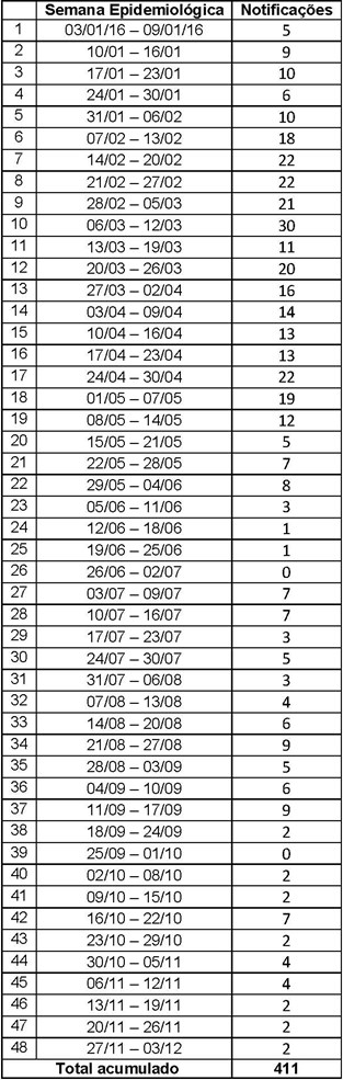 Tabela com o número de notificações de Chikungunya por semana epidemiológica 2016