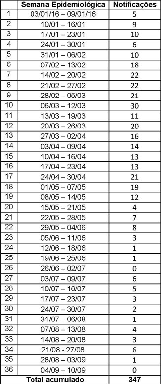 Tabela com o número de notificações de Chikungunya por semana epidemiológica 2016