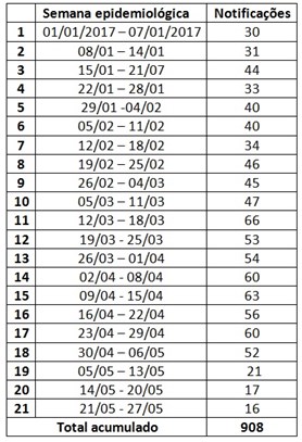 A Secretaria de Estado da Saúde (Sesa) informa que foram notificados no Espírito Santo 908 casos de Chikungunya entre 1º de janeiro de 2017 e o último sábado (27). Dentro desse total há 01 óbito confirmado. Há registro de circulação do vírus em 17 municípios: Aracruz, Afonso Cláudio, Baixo Guandu, Cariacica, Cachoeiro de Itapemirim, Colatina, Guarapari, Guaçuí, Jerônimo Monteiro, Linhares, Montanha, Nova Venécia, Serra, São Mateus, Vargem Alta, Vila Velha, Vitória.