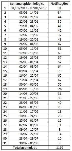 A Secretaria de Estado da Saúde (Sesa) informa que foram notificados no Espírito Santo 1.179 casos de Chikungunya entre 1º de janeiro de 2017 e o último sábado (05). Dentro desse total, há 01 óbito confirmado. Há registro de circulação do vírus em 20 municípios: Afonso Cláudio, Alfredo Chaves, Aracruz, Baixo Guandu, Cachoeiro de Itapemirim, Cariacica, Colatina, Conceição da Barra, Guaçuí, Guarapari, Jerônimo Monteiro, Linhares, Marechal Floriano, Montanha, Nova Venécia, São Mateus, Serra, Vargem Alta, Vila Velha e Vitória.