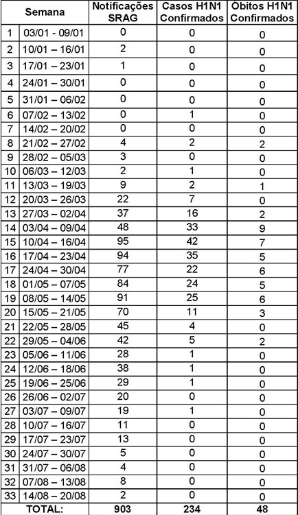Quanto ao número de óbitos causados por H1N1, foram registrados 48 até a última semana epidemiológica, e outros três óbitos por Síndrome Respiratória Aguda Grave estão em investigação para determinar o agente causador, uma vez que a SRAG pode ter diferentes causas, não somente os vírus Influenza.