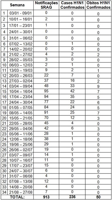Quanto ao número de óbitos causados por H1N1, foram registrados 50 entre 03 de janeiro e 27 de agosto de 2016, sendo os últimos óbitos confirmados referentes às semanas epidemiológicas 20 e 22. Outros três óbitos por Síndrome Respiratória Aguda Grave estão em investigação para determinar o agente causador, uma vez que a SRAG pode ter diferentes causas, não somente os vírus Influenza.