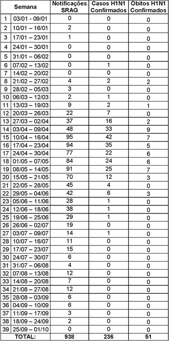 Quanto ao número de óbitos causados por H1N1, foram registrados 51, entre 03 de janeiro e 01 de outubro de 2016. Um (01) óbito por Síndrome Respiratória Aguda Grave está em investigação para determinar o agente causador, uma vez que a SRAG pode ter diferentes causas, não somente os vírus Influenza.