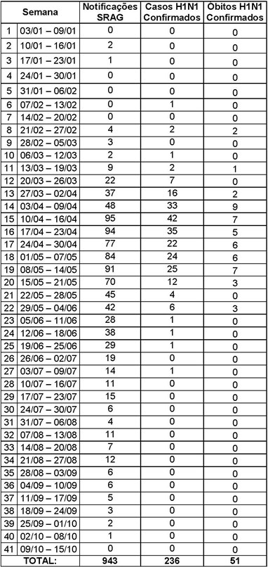 Quanto ao número de óbitos causados por H1N1, foram registrados 51, entre 03 de janeiro e 15 de outubro de 2016. Dois óbitos por Síndrome Respiratória Aguda Grave estão em investigação para determinar o agente causador, uma vez que a SRAG pode ter diferentes causas, não somente os vírus Influenza.