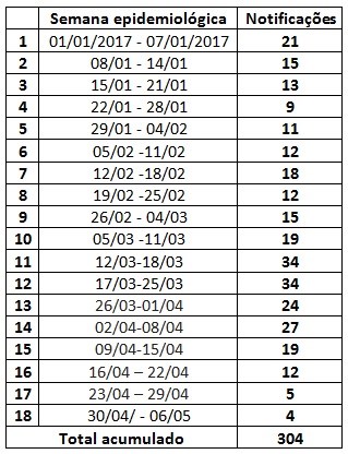 Tabela com o número de casos de zika por semana epidemiológica 2017