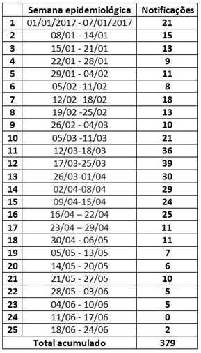 Tabela com o número de casos de zika por semana epidemiológica 2017